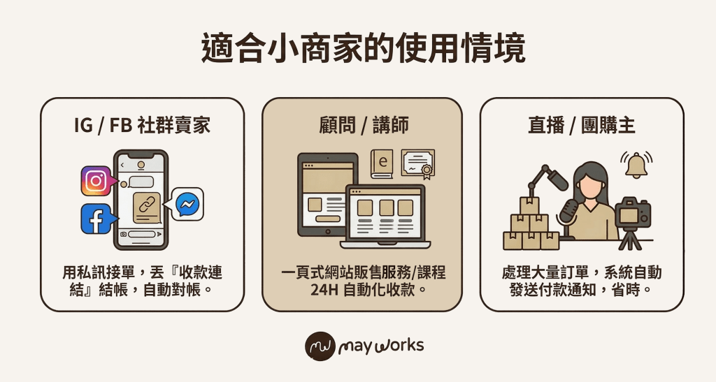 | 您的時間成本 | 較低 收款、系統通知收款成功、查帳…等,都可自動化完成。 | 高 需花時間溝通、給帳號、查帳、確認款項。 |